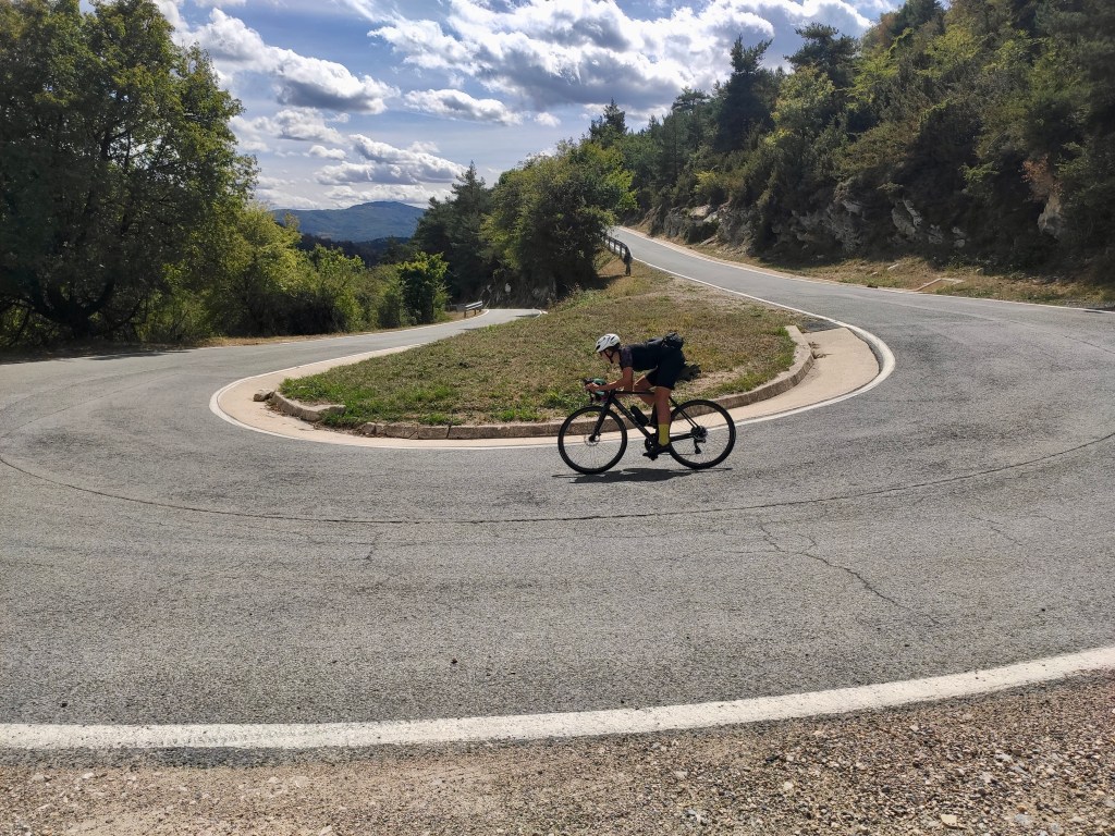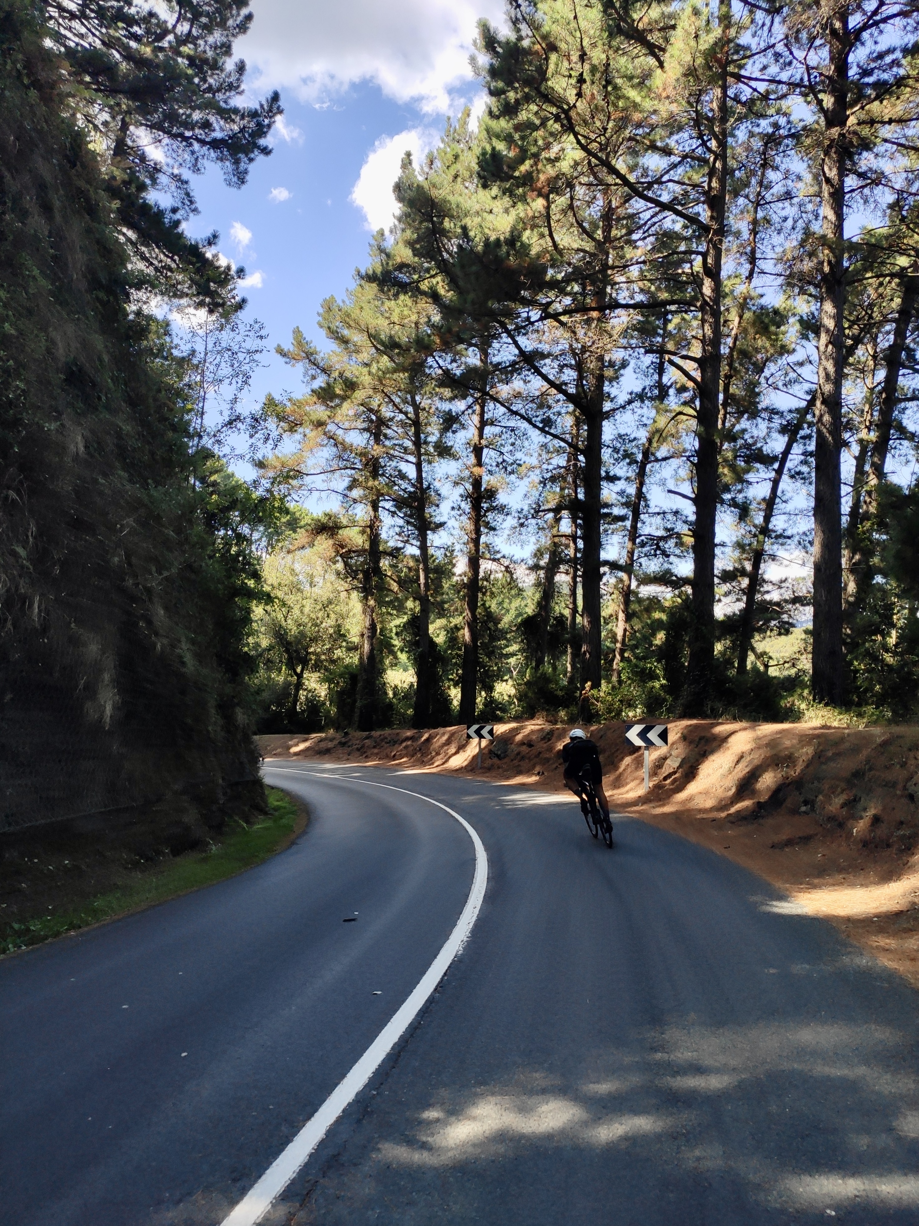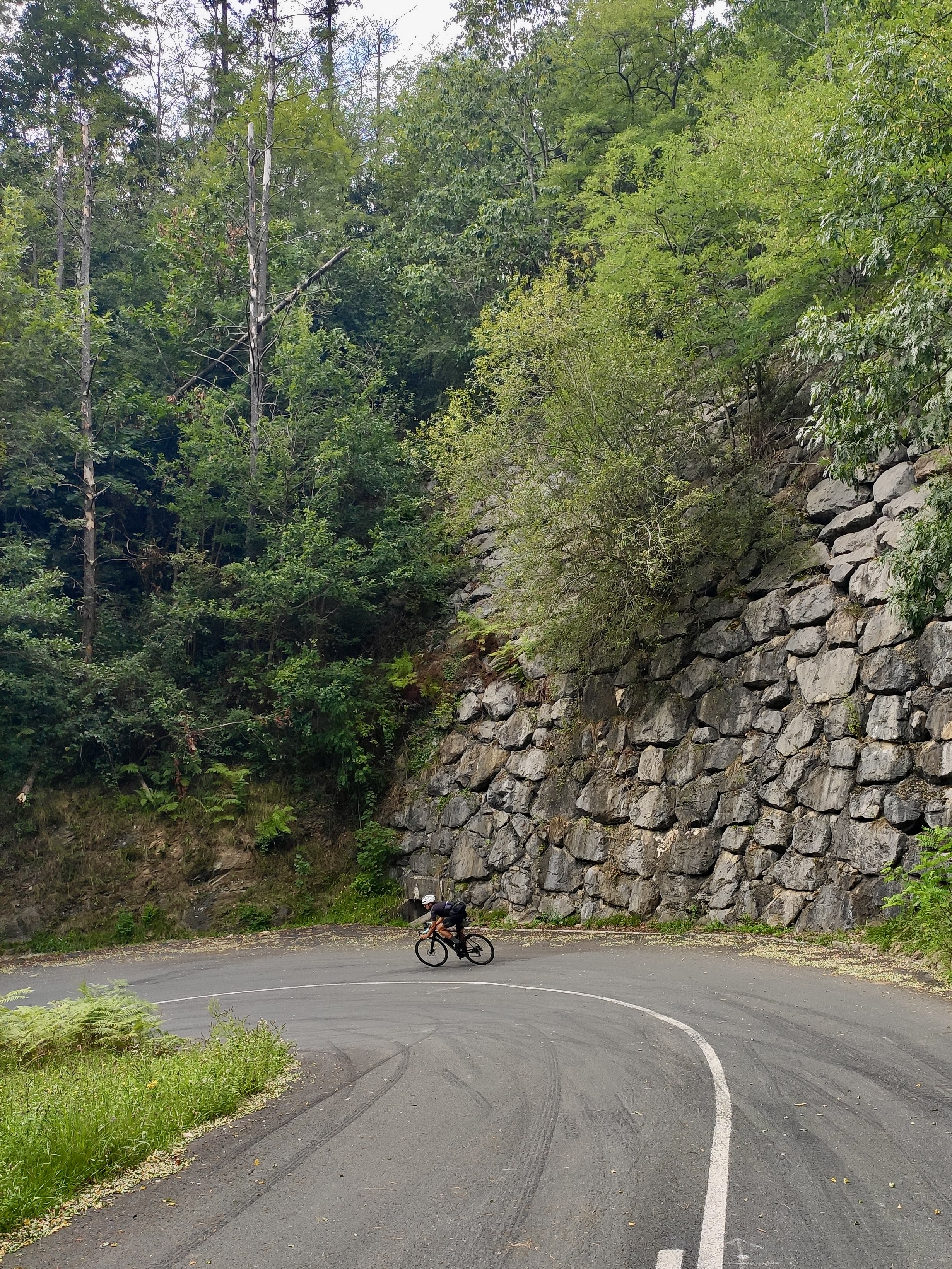 The climb had some lovely hairpins, a generally friendly gradient, with just a few pitches into the teens gradients. The top boasted a wide panorama once the tree cover parted, if for a moment, and off we sped down the other side.