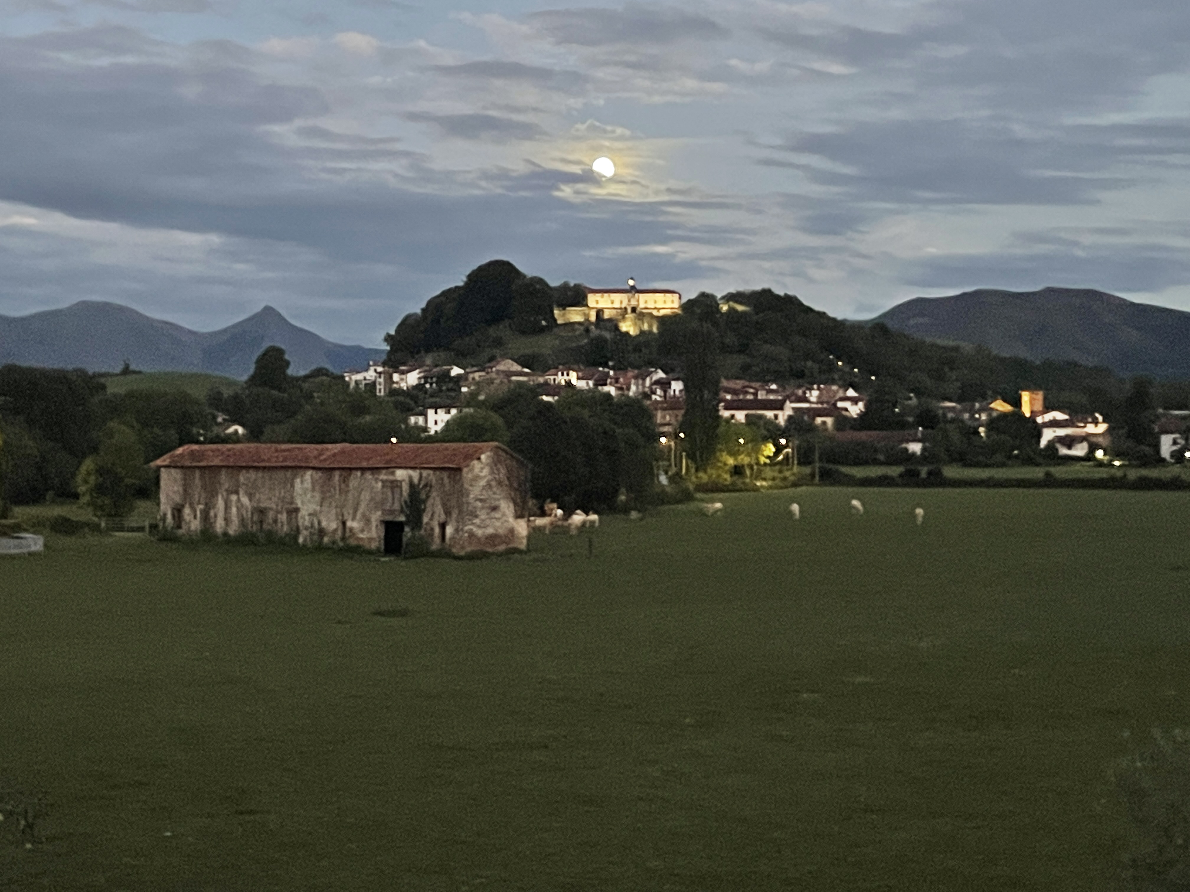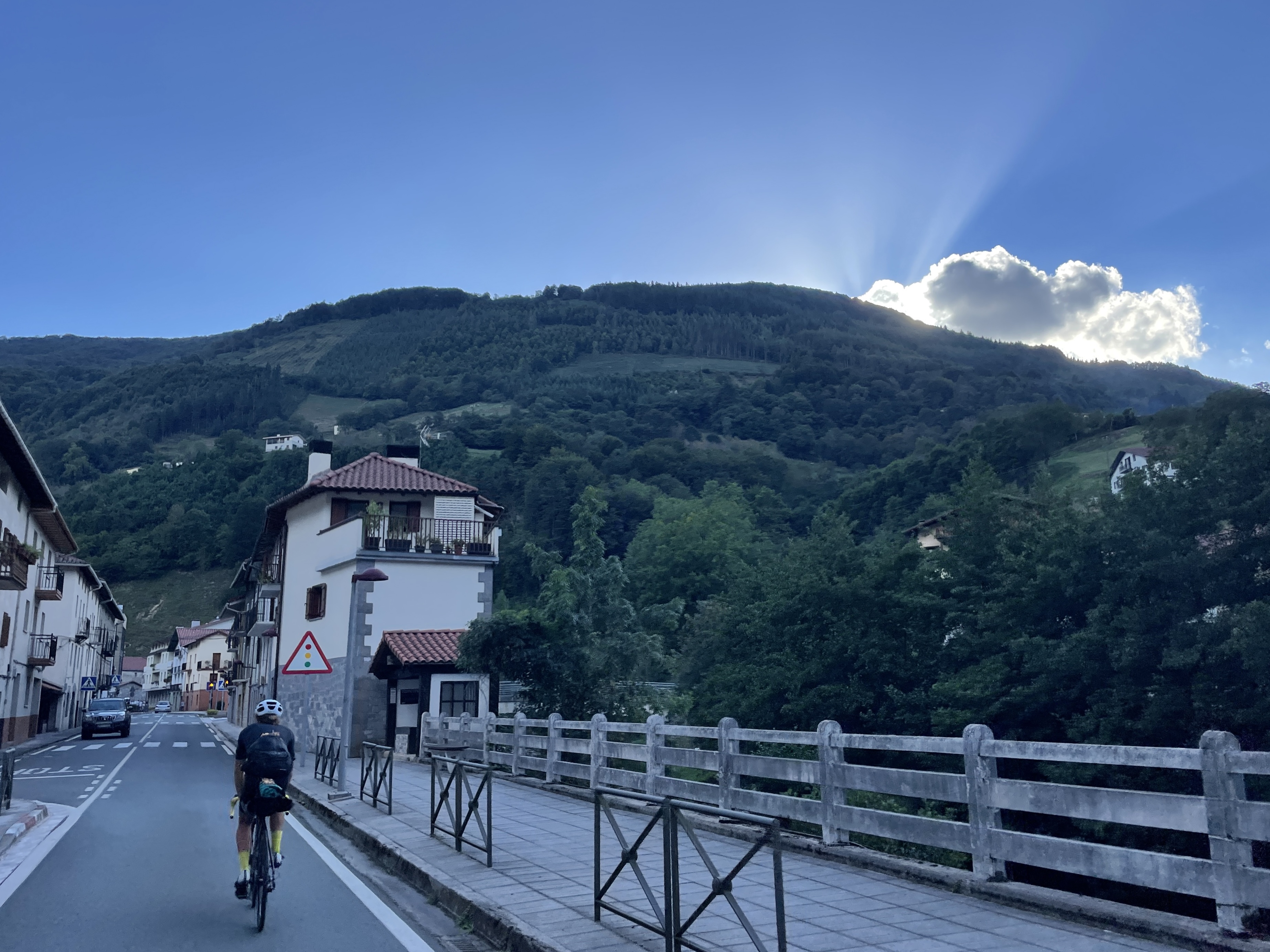 That lead us into what was supposed to be the day’s second last climb; our first foray above 1000m at the Ibaneta: from the side of our approach only really a long drag. What followed down the other side though, was absolute tarmac nirvana, the descent swooping and whooshing from flowy corner to flowy corner, our grins uncontrollable ! Somewhere on the way down, we were due to take a sharp right to commence our last climb of the day: an ominous 9km at 9% prospect according to our Garmins. Yesterday’s lengthy jaunt not long past, tomorrow’s even longer and harder climbing day looming, this last and somewhat unnecessary detour was hard to argue in favour of, and thus we followed the valley all the way down to the border – vive la France (!) – and beyond, into St JPdP. Yep. That’s easier. Although, actually: Saint Jean Pied de Port. You’re beautiful!! Wowsers !! We hadn’t expected much- anything actually, but what a charming old town, a river cascading through its centre and spanned by a series of bridges, old buildings and castelations, just a charm! Shopping and dinner done, as the crickets sang their lullaby and the full moon glowed, we started to get a little worried as we eyed the forecast for tomorrow……..