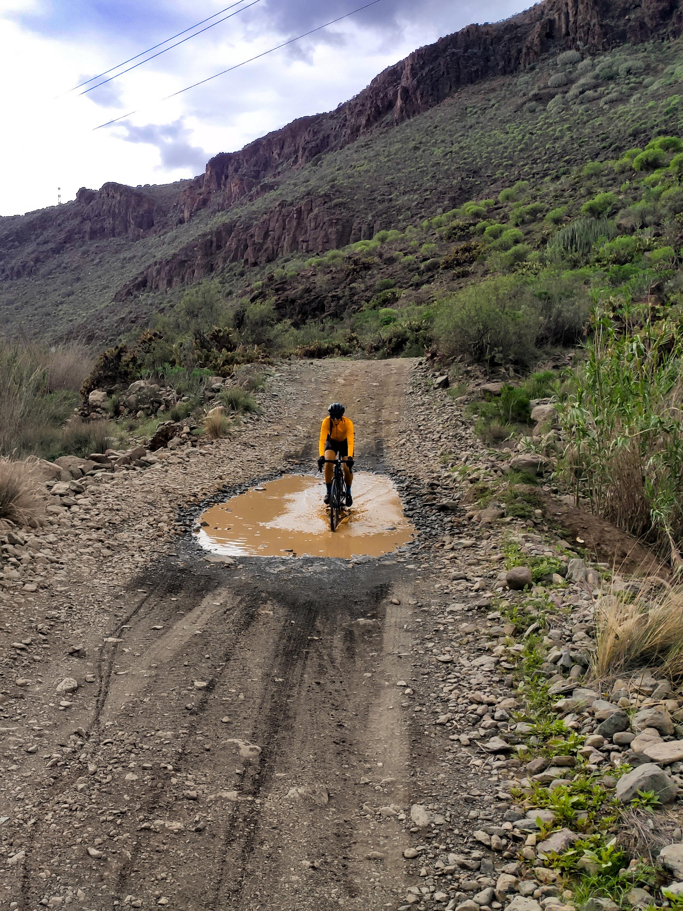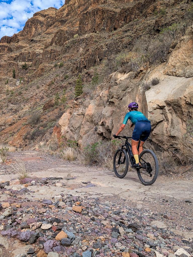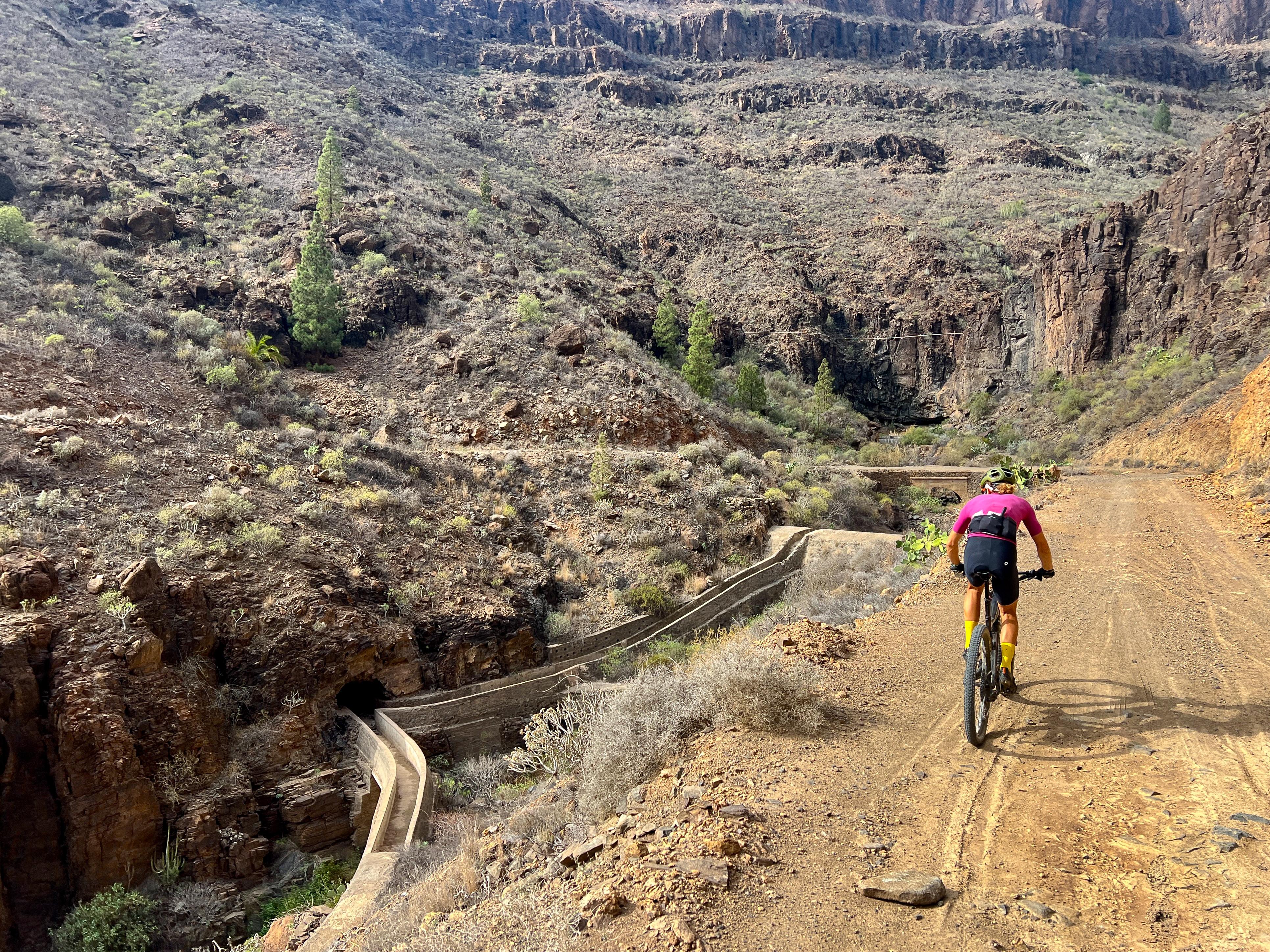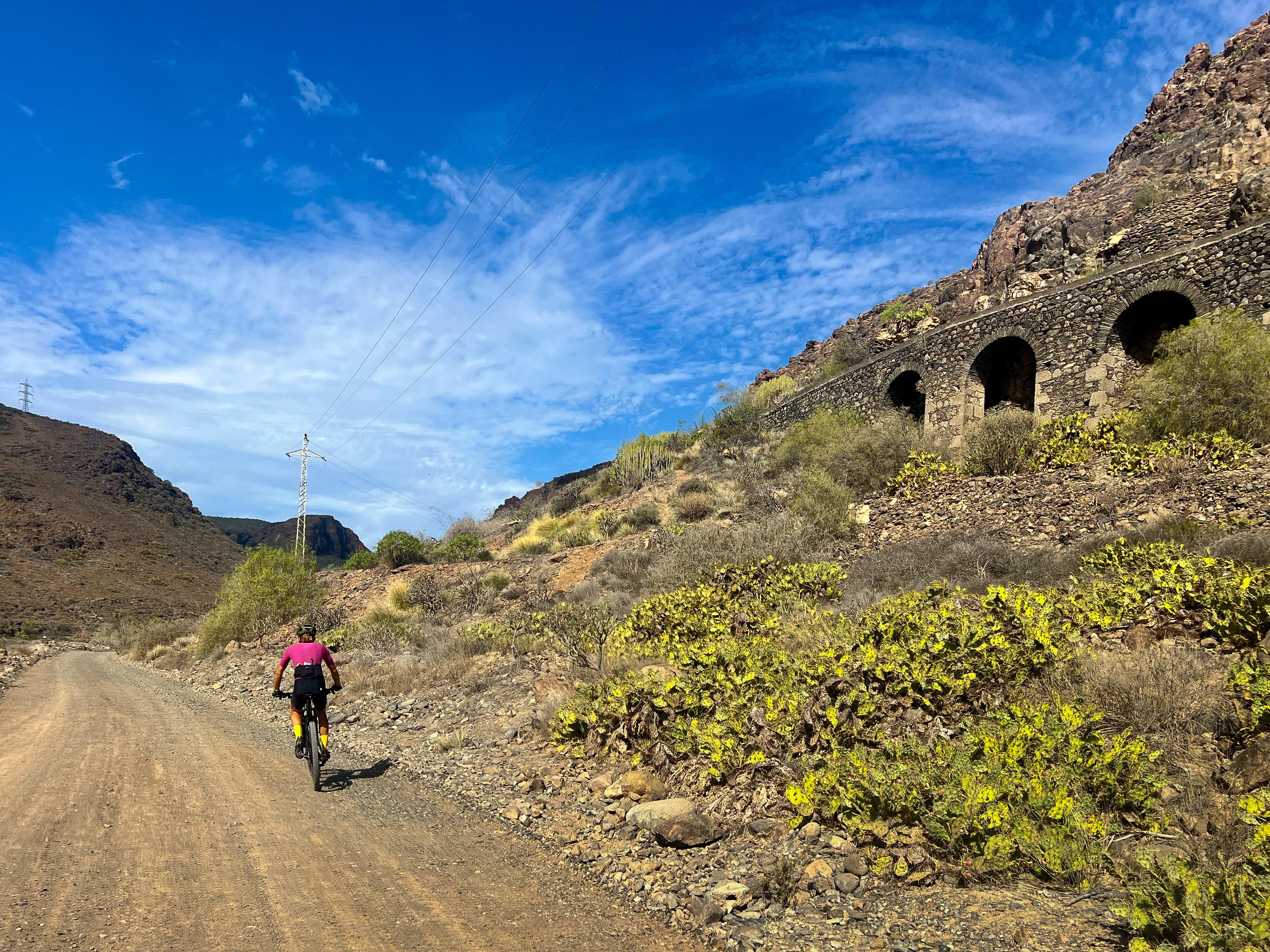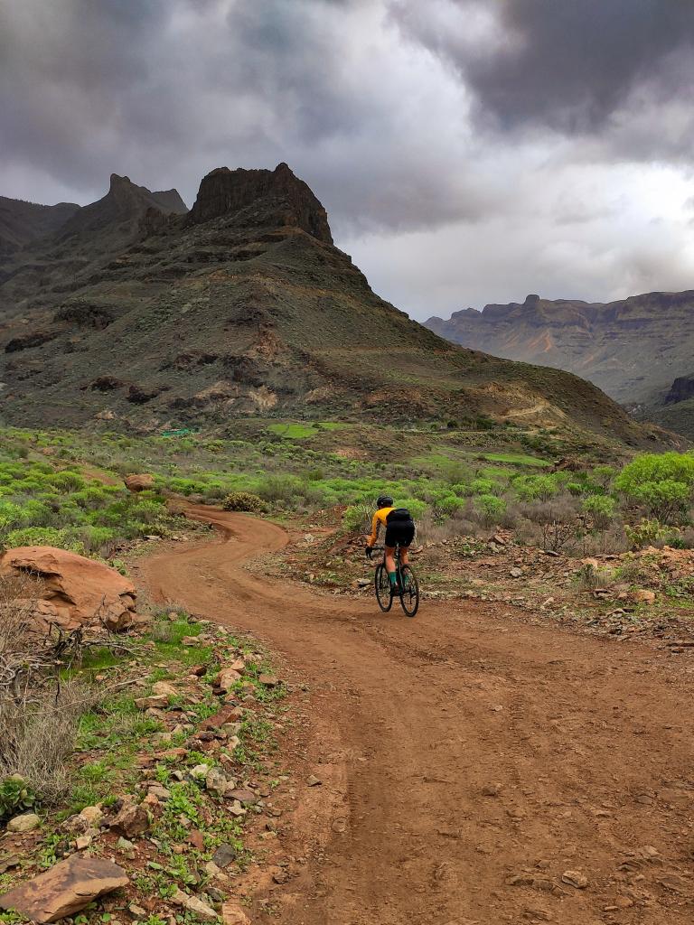 Continuing to the west direction Ayaguares, you weave around to the next barranco, no evidence left whatsoever of the deep, eroded and narrow gully that once challenged riders on this route. You pass a corner where a small reservoir fills up in very wet periods, and shortly after face into the one section of the route on which it still feels like an MTB has the upper hand over a gravel bike. I call it the rainbow rocks section; its mix of ochres, cyan and amarillo hues a beautiful distraction from the rough exposed rock slabs you have to navigate here. This section now remains as the last ‘un-resurfaced’ stretch, but nevertheless, we know of at least one person who has tamed it with 28mm road tyres..!