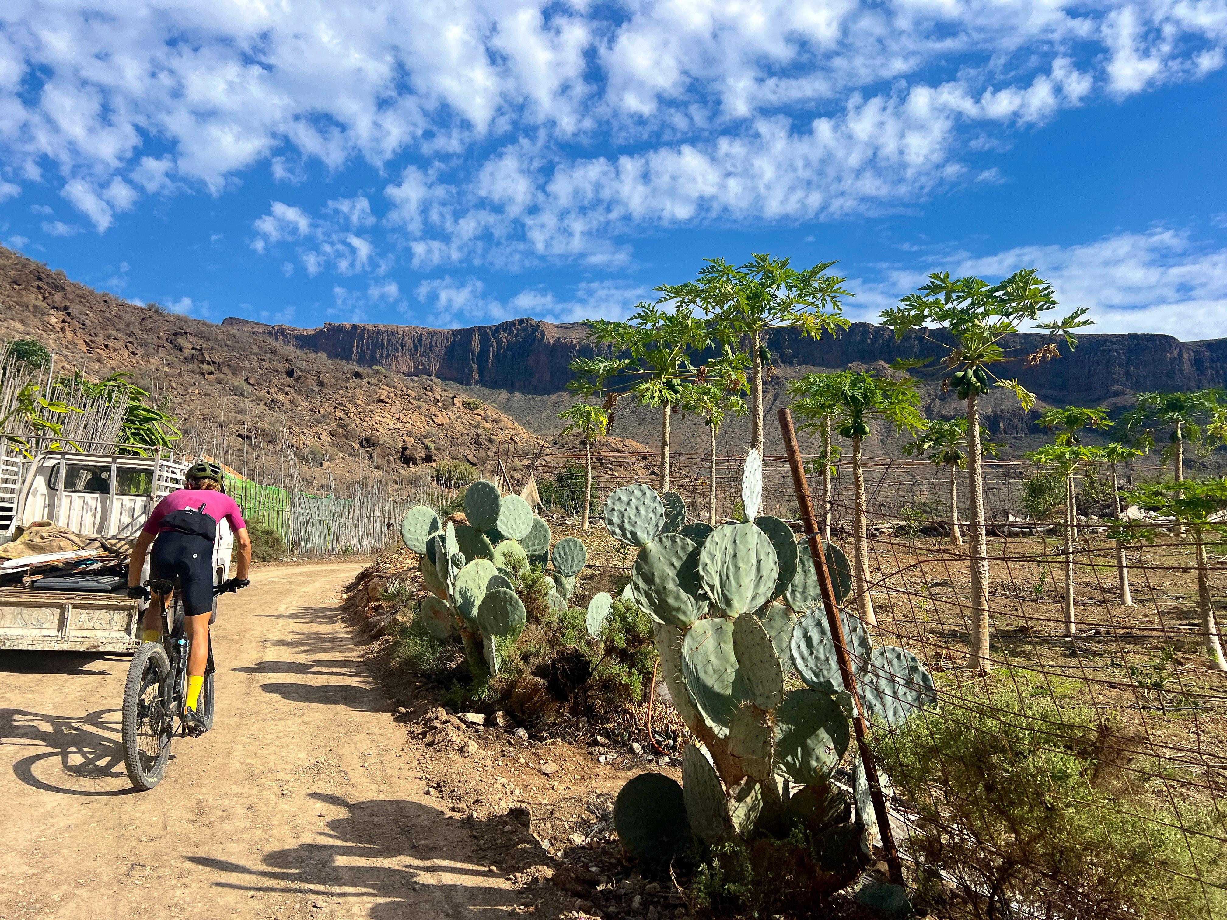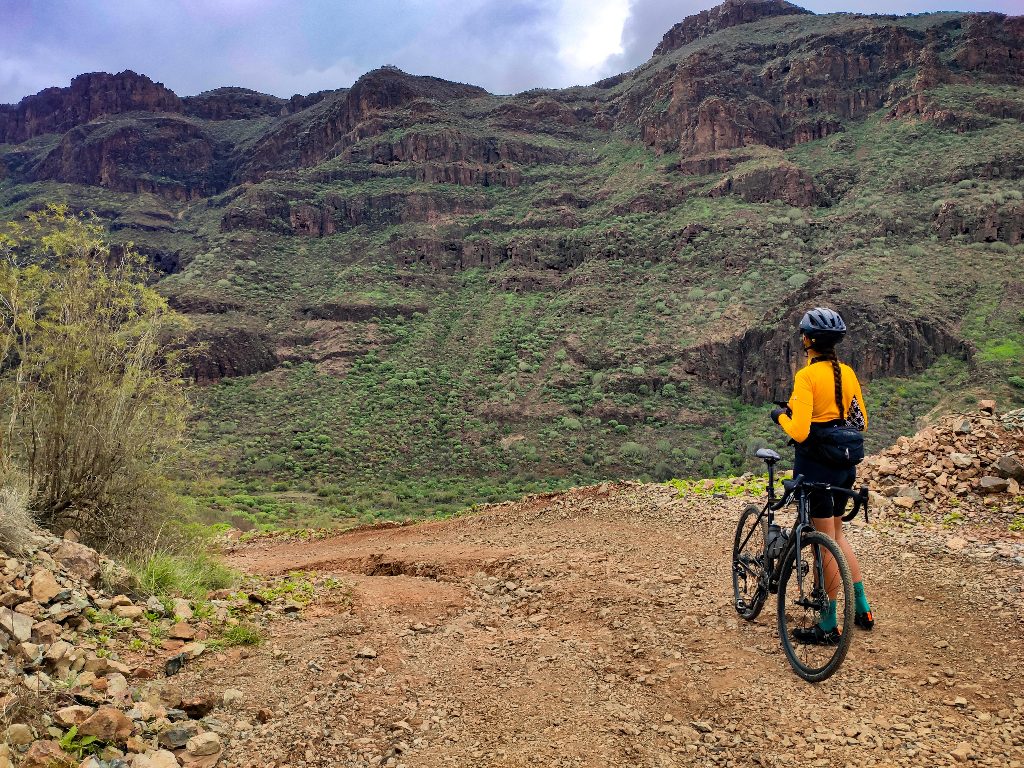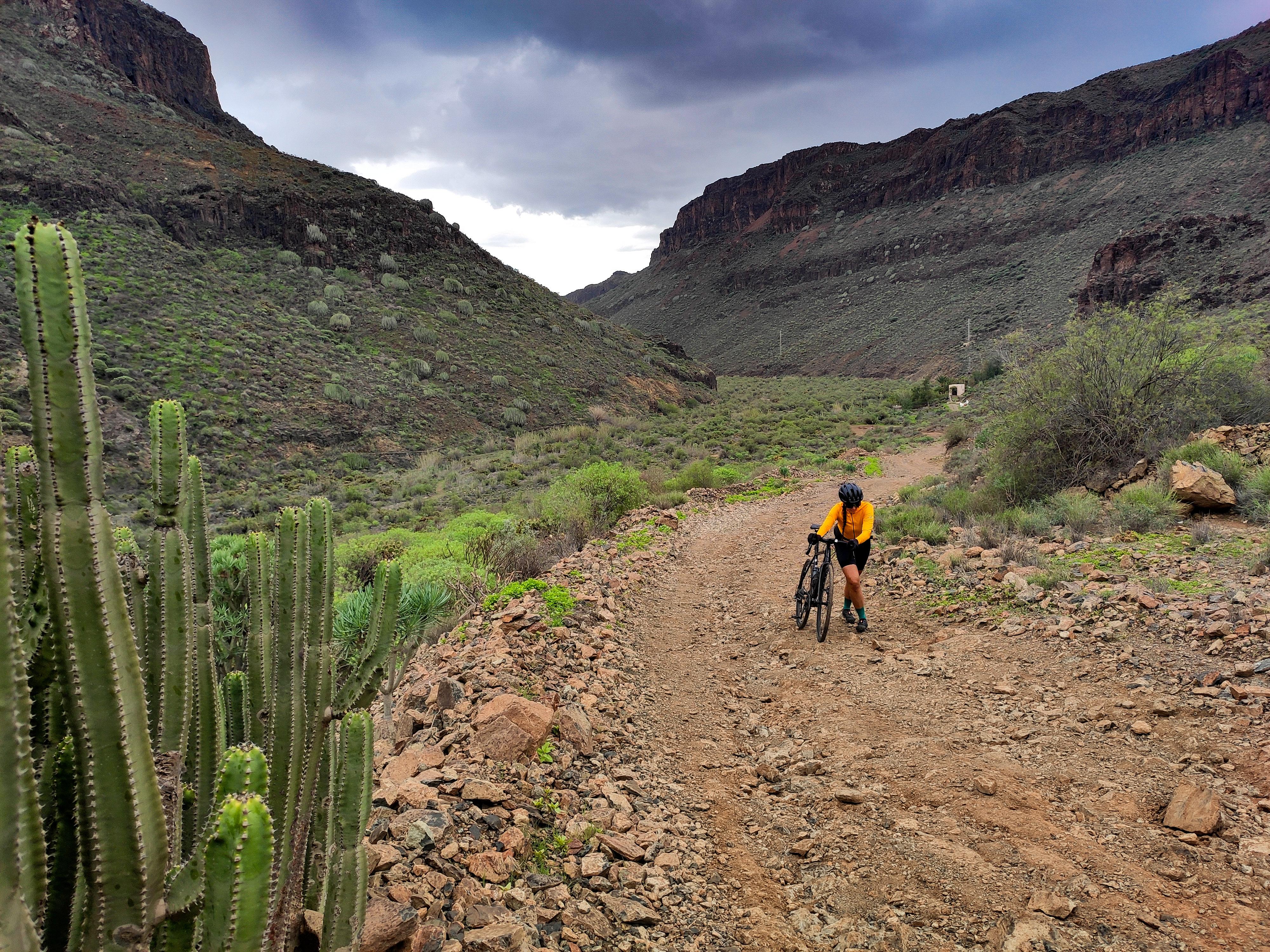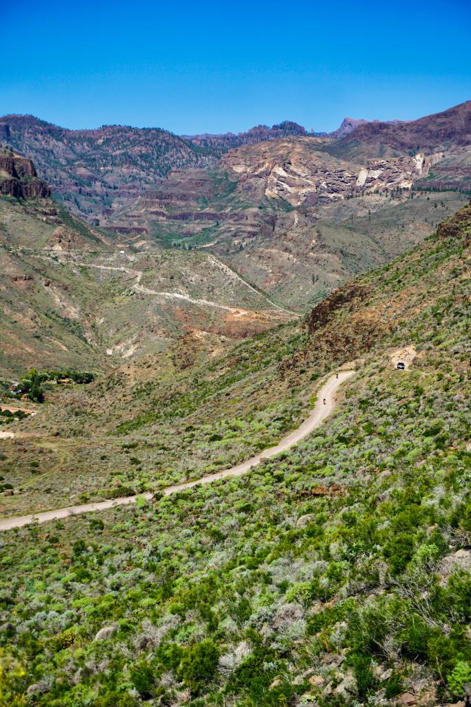 Continuing to the west direction Ayaguares, you weave around to the next barranco, no evidence left whatsoever of the deep, eroded and narrow gully that once challenged riders on this route. You pass a corner where a small reservoir fills up in very wet periods, and shortly after face into the one section of the route on which it still feels like an MTB has the upper hand over a gravel bike. I call it the rainbow rocks section; its mix of ochres, cyan and amarillo hues a beautiful distraction from the rough exposed rock slabs you have to navigate here. This section now remains as the last ‘un-resurfaced’ stretch, but nevertheless, we know of at least one person who has tamed it with 28mm road tyres..!